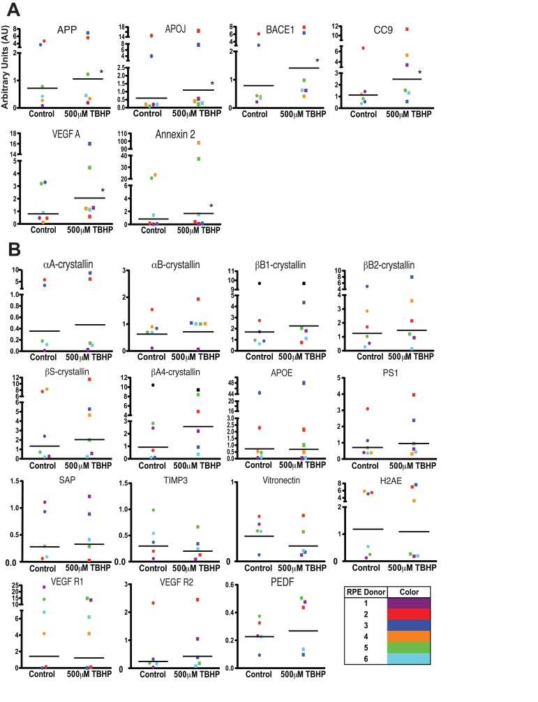 We then compared the mean expression level of each transcript in hRPE and ARPE-19 cells after 5 days of TBHP. Significant differences were observed in βS- and βA4-crystallins, APP, BACE1, VEGF A, PEDF, Annexin 2 (Welsh's t-test, p<0.05), αB-crystallin, APOJ, CC9 (p<0.01), and Vitronectin (p<0.001). We then compared the total drusen-related transcript expression profile (Appendix A) of each individual hRPE cell line to that of ARPE-19 cells after 5 days of TBHP and found that the hRPE expression response differed from that of the ARPE-19 in all cases (2-way ANOVA, p<0.01). This evidence demonstrated that none of the individual hRPE lines tested behaved similarly to ARPE-19 in this expression response assay.