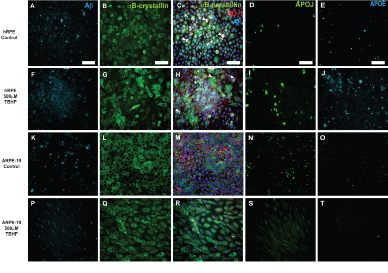 Following the stress protocol, hRPE cells in 24-well culture plates were rinsed in calcium/magnesium-free phosphate-buffered saline (CMF-PBS) for 1 minute and fixed in 4% Phem-fix [51] for 20 minutes followed by two 20-minute washes in CMF-PBS. Cells were blocked and permeabilized with 5% normal goat serum (NGS) (Vector Laboratories) in PBS with 0.3% Triton (Sigma). Cells were incubated with primary antibodies in 5% NGS in PBS overnight at 4 degrees Celsius: αB-crystallin (Stressgen, 1:2500), Aβ4G8 (Millipore, 1:100), APOE (Millipore, 1:50), Clusterin 41D (Millipore, 1:100), ZO-1 (Invitrogen, 1:100). After rinsing again in PBS, cells were incubated with Alexa fluorescein-conjugated secondary antibodies (1:1200) (Invitrogen) with 5% NGS in PBS for 45 minutes at room temperature and shielded from light. After a further wash, cells were incubated with DAPI anti-nuclear probe (1 μg/μL; Sigma-Aldrich CO, St. Louis, MO) for 10 minutes in the dark at room temperature. After immunostained samples were cover-slipped with Vectashield mounting media (Vector Laboratories), two-dimensional phase and fluorescent images were acquired using an inverted microscope (Axiovert 200) with digital camera (AxioCam MRm) and AxioVision version 4.6.3 software (Carl Zeiss, Thornburg, NY). Immunodetection studies were controlled for background, autofluorescence, and fluorescence artifacts by omitting the primary antibody.