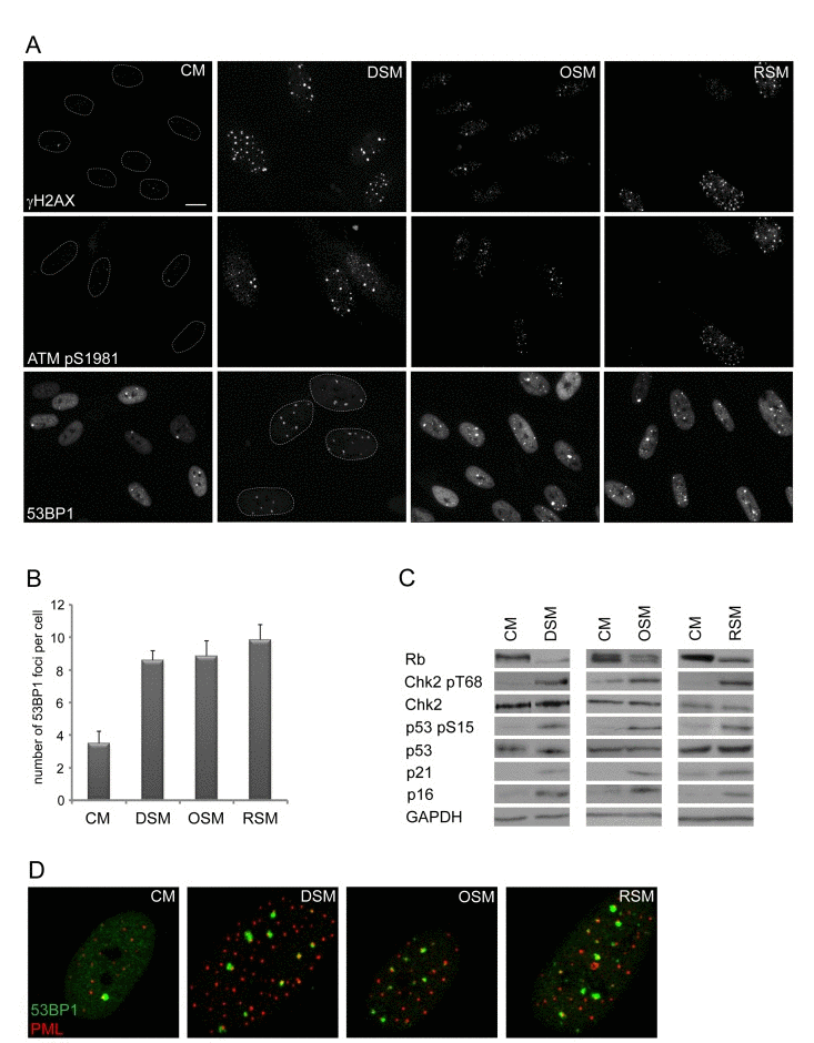 To analyze this phenomenon in more detail, we first asked whether cells undergoing senescence induced by any of the three major triggers: replication, activated oncogenes or genotoxic drugs possess analogous potential to induce DNA damage in neighboring cells. We exposed human normal BJ fibroblasts grown at relatively low passage (30 population doublings) to culture media partly enriched (1:1) by conditioned media of BJ cells brought to senescence either by genotoxic stress induced by etoposide (drug-induced senescence, DIS), activated H-RasV12E (oncogene-induced senescence; OIS; [54]) or exhaustion of replicative potential (replicative senescence; RS; population doubling 80; see Supplementary Figure 1B-E for characterization of “parental” senescent cells). Intriguingly, the exposure of ‘young’ BJ cells to any of the three types of senescence-conditioned media resulted in increased numbers of nuclear γH2AX foci. The elevation of γH2AX foci and total level of γH2AX was apparent from day 2 after transfer of cells to ‘senescent’ media and persisted at least to day 20 of continuous exposure as exemplified in Fig. 1A for DIS-BJ, RS-BJ and OIS-BJ conditioned media. Serine 1981 phosphorylated ATM, an active form of a kinase involved in serine 139 phosphorylation of H2AX [55], was also elevated in exposed BJ cells and accumulated in DNA damage nuclear foci, as well as 53BP1 (see Figs. 1A, B for foci quantification), another factor participating in DNA DSB sensing and repair [56]. Furthermore, increased levels of activated forms of two ATM substrates involved in activation of cell cycle checkpoints, checkpoint kinase Chk2 [57] and tumor suppressor p53 [58, 59], were detected in cells exposed to all three types of senescence-conditioned media followed from day 10 and continuing to day 20 (Fig. 1C) using antibodies against phospho-threonine 68 of Chk2 and phospho-serine 15 of p53, respectively. Note that the 53BP1/γH2AX nuclear foci co-associated with PML nuclear bodies (Fig. 1D), a feature characteristic for persistent DNA damage lesions [60-63], termed DNA-SCARS [64]. Besides normal human fibroblasts, we observed similar effects of DIS-conditioned medium inducing ‘paracrine’ DNA damage in U2OS cells (Suppl. Figs. 2A-C show that to induce drug-induced senescence in U2OS cells, a combination of 10 μM BrdU and 10 μM DMA were used, as previously described [24]). Clastogenic effect of the DIS secretome was further supported by appearance of enhanced micronucleation in U2OS cells exposed to senescent-conditioned medium (Suppl. Fig. 2D). Notably, no micronuclei were observed in any of the three types of bystander BJ cells.