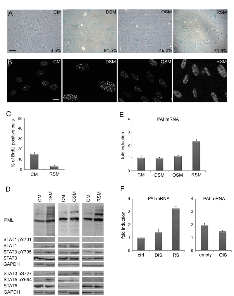 JAK inhibitor I, TGF beta receptor 1 inhibitor II and IL1 receptor antagonist were purchased from Merck KGaA (Darmstadt, Germany). The following antibodies were used for immunoblot: rabbit polyclonal antibodies against PML, STAT3 (clone C-20), NEMO, total Chk2, p53 and p16, mouse monoclonal antibody against p21 all from Santa Cruz Biotechnology (Santa Cruz, CA, USA), mouse monoclonal antibody against phosphotyrosine 705 of STAT3, rabbit polyclonal antibodies against phosphotyrosine 701 of STAT1, phosphoserine 727 of STAT3, phosphoserine 15 of p53, phosphothreonine 68 of Chk2, phosphoserine 465/467 of SMAD2, total STAT5 and phosphotyrosine 694 of STAT5 all from Cell Signaling Technology (Danvers, MA, USA), mouse monoclonal antibody against GAPDH (GeneTEX, Irvine, CA, USA), mouse monoclonal antibody against phosphoserine 139 of histon H2AX (Millipore, Billerica, MA, USA), mouse monoclonal antibody against Rb (BD Biosciences), mouse monoclonal antibody against H-RAS (Calbiochem) and mouse monoclonal antibody against total STAT1 (SM2 clone, Exbio, Vestec, Czech Republic).