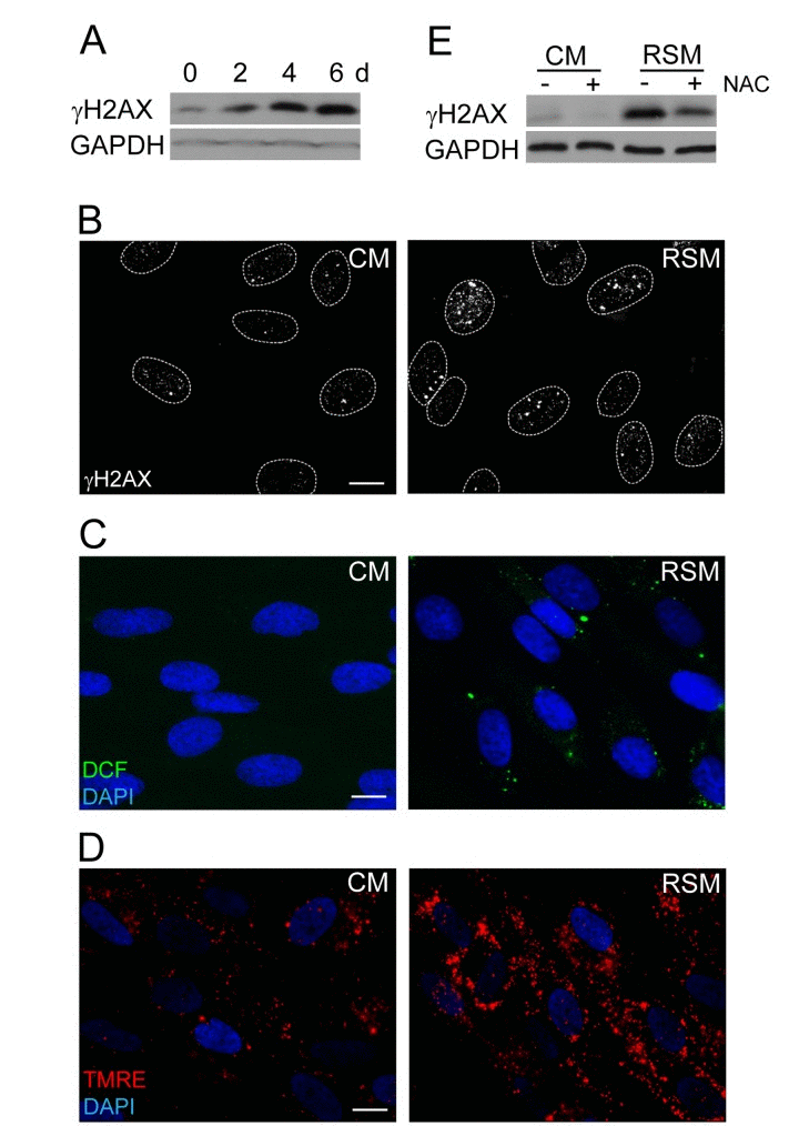 The next question we asked was whether the DNA damage observed in bystander cells (detected as increased levels of γH2AX; Fig. 3A, B) can be linked with elevated amounts of reactive oxygen species (ROS) arising as a consequence of SAS-induced changes in mitochondrial function [72]. Indeed, probing of control and bRS cells (i.e. BJ cells treated with medium from replicative senescent cells) with 2',7'-dichlorofluorescein indicated elevated levels of ROS in bRS cells (Fig. 3C). The observed enhanced ROS and DNA damage could be a consequence of increased mitochondrial potential, a scenario consistent with our measurements with TMRE (Fig. 3D). Indeed, addition of N-acetylcysteine, a scavenger of reactive oxygen radicals [73], to senescence-conditioned media significantly diminished the level of the induced γH2AX (Fig. 3E), indicating a causal link between ROS production and DNA damage observed in the bystander cells.