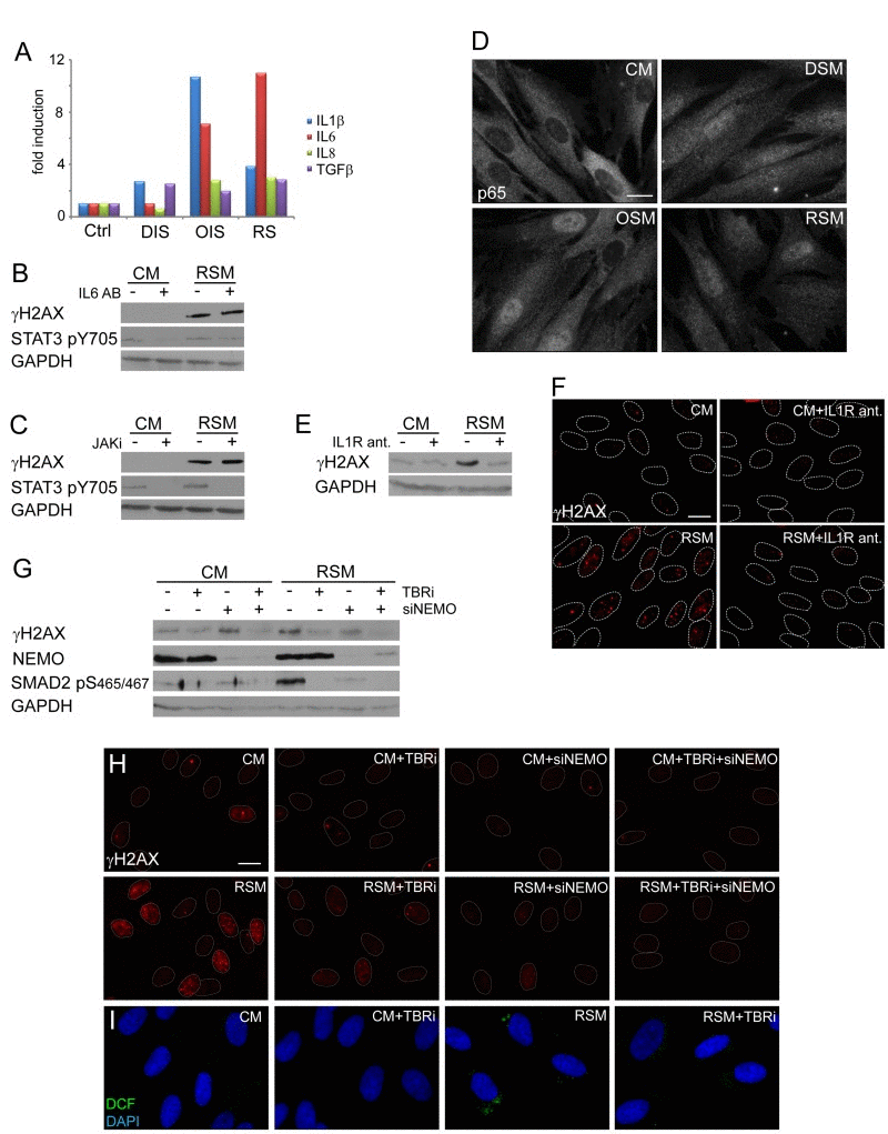 Proinflammatory cytokines including IL1β can trigger production of ROS (see e.g. [75]). Both parental and bystander senescent BJ cells irrespective of senescence the initial promoting mechanism express and secrete IL1β (see Table 1 and Fig. 4A). Since IL1β was described as a strong activator of NFκB signaling [76], we compared the subcellular distribution of the p65 subunit of NFκB in replicative, oncogene- and drug-induced bystander senescent cells relative to control non-senescent cells. As shown on Fig. 4D (see also Suppl. Fig. 2I for U2OS), all three forms of senescent cells show redistribution of p65 from cytosol into the nucleus indicative of activation of the NFκB signaling pathway in bystander cells. Inhibition of IL1 receptor signaling using IL1 receptor antagonist led to a significant reduction of γH2AX levels (Fig. 4E) and γH2AX foci (Fig. 4F) in bRS BJ cells. Moreover, siRNA-mediated knockdown of NEMO/IKKγ subunits of the NFκB-activating signalosome complex necessary for NFκB activation [77] resulted in partial decrease of γH2AX levels (Fig. 4G) and γH2AX foci in bRS BJ cells (Fig. 4H) supporting the involvement of IL1/NFκB pathway in DNA DSB formation in bystander senescent cells.