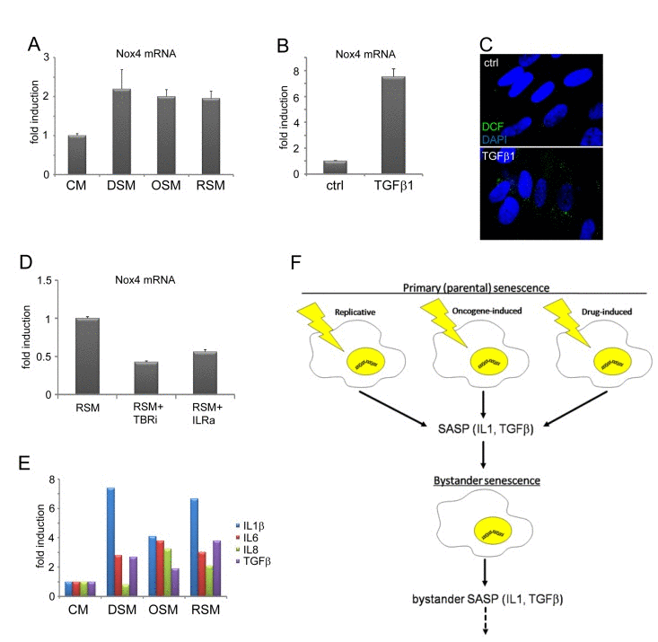In this study we focused on the following conceptually important questions: i) Is the capacity to induce SASP-associated bystander senescence a feature shared by cells undergoing various forms of ‘primary/parental’ senescence?; ii) Which cytokine species and/or signaling pathways are causally involved in bystander senescence? and iii) What is their link with potential DNA damage in such settings? We found that culture media conditioned by cells undergoing replicative, oncogene- and drug-induced primary senescence are all capable of inducing elevated ROS production and DNA damage in normal bystander cells, and trigger their transition into cellular senescence. Furthermore, experimental inhibition of IL1β/NFκB and TGFb/ SMAD signaling led to: a) decreased expression of NADPH oxidase Nox4; b) decreased ROS production and c) suppression of DDR in bystander cells, indicating that IL1β and TGFβ are critical components of SASP causally involved in bystander senescence.