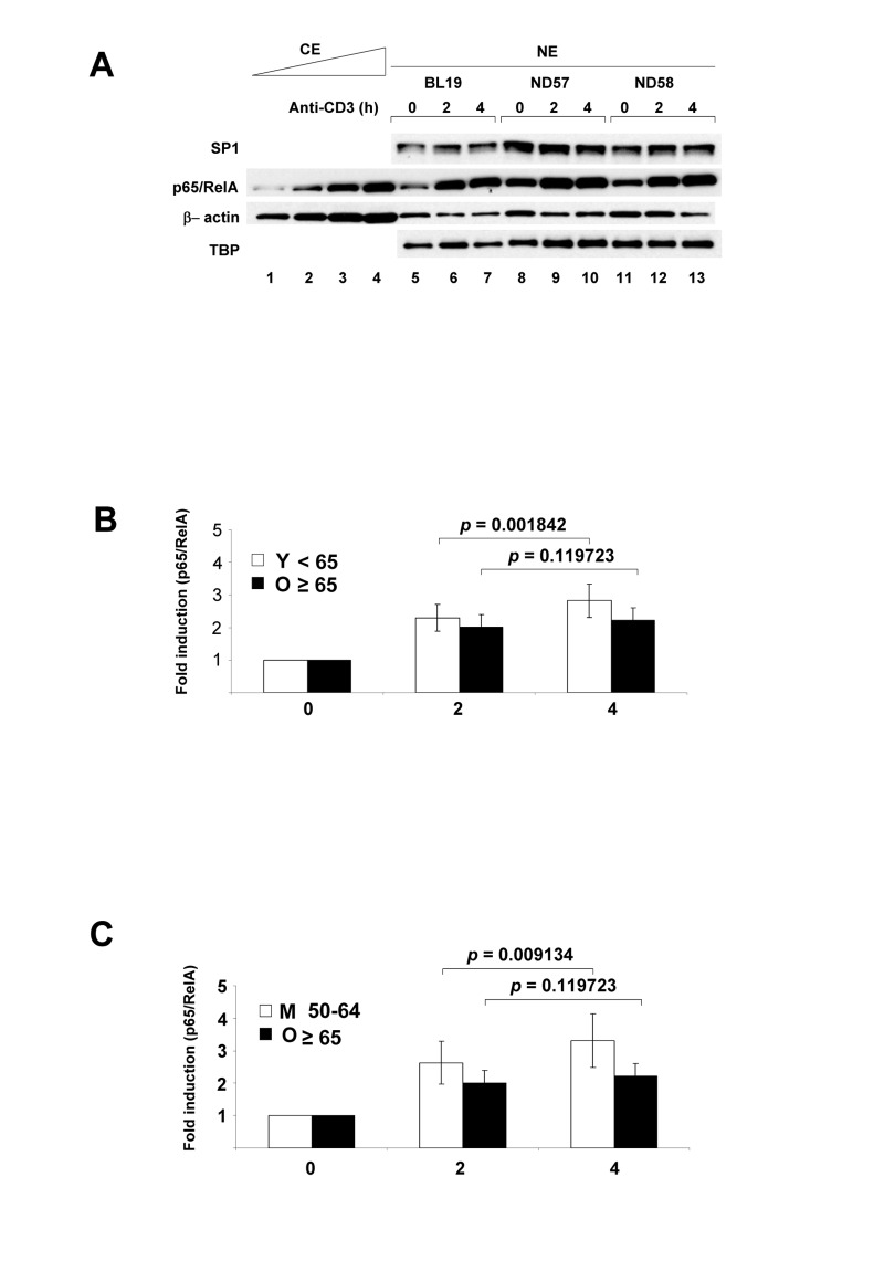 We purified CD4+ T cells from 31 donors of age range 25-81 years (see Figure S1 and Table S1), and activated them with plate-bound anti-CD3 antibodies for 2h and 4h prior to preparation of nuclear and cytoplasmic extracts, and RNA. As controls, we used cells incubated for 4h at 37° in the absence of anti-CD3. We used anti-CD3 as an activating stimulus rather than IL-1 or TNFα in order to gain insight about age-associated attenuation of antigen-specific immune responses; the times of activation were chosen to limit the analysis to primary effects of TCR signaling. We first analyzed the response of the transcription factor NF-κB to TCR activation. Nuclear extracts were fractionated by SDS-PAGE, transferred to PVDF membranes and assayed for p65/RelA induction by immunoblotting (Figure 1A). To normalize between extracts we examined several ubiquitous proteins such as SP1, β-actin, TBP. We found that all of these were suitable for comparing extracts from one individual, but varied too much to compare between individuals (Figures S2A, S2B). To get an absolute measure of nuclear p65/RelA expression, we used a standard set of p65/RelA-expressing extracts (Figure S2C).