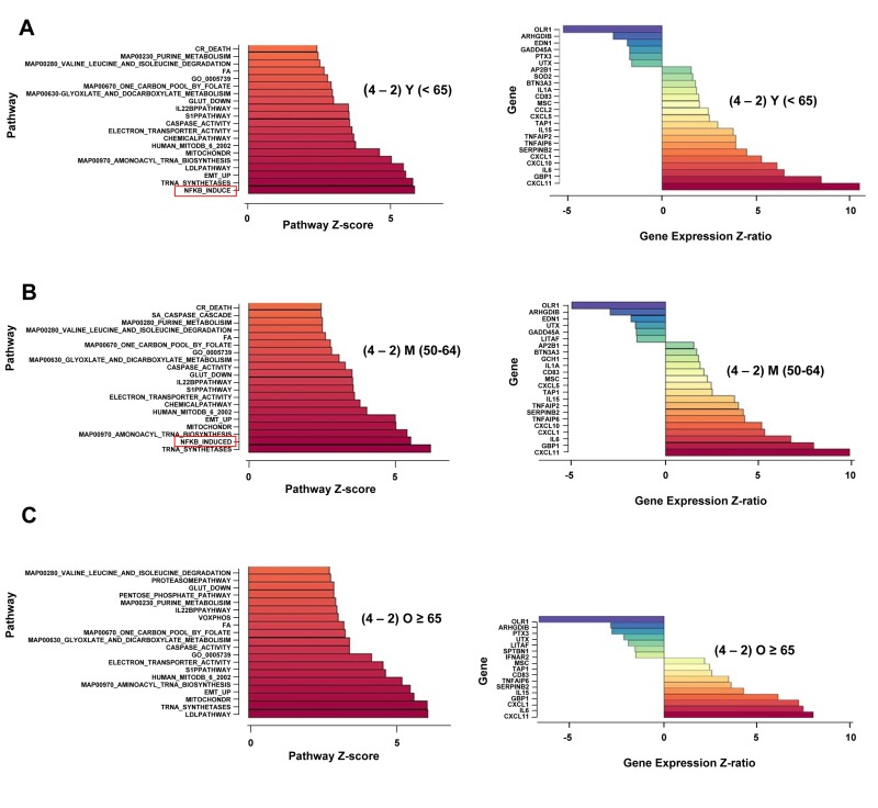 To critically test the idea that NF-κB activation was not sustained in the elderly, we identified putative NF-κB target genes that were induced between 2h and 4h of activation. We found that in the younger and middle-age cohorts, 18 genes within this pathway were significantly up-regulated between 2h and 4h, whereas only 10 genes were significantly up-regulated in the older group (Figure 2A-C). Prominently missing from the older group were genes encoding CXCL10, TNFAIP2, CCL2, CXCL5, and IL-1α. Moreover, several genes that continued to be up-regulated in the older group had lower Z ratios than the same genes in the younger group. These genes included CXCL11 (Z-ratio(O) = 8.02; Z-ratio (Y) = 10.54); GBP1 (Z-ratio(O) = 6.14; Z-ratio(Y) = 8.51), and SERPIN B2 (Z-ratio (O) = 3.6; Z-ratio (Y) = 4.51). Thus, more than half of “NF-κB-induced” genes that were up-regulated between 2h and 4h in the younger group were attenuated in the older group. Together, this set of genes identified the transcriptional consequences of the lack of continued NF-κB activation in response to TCR stimulation in CD4+T cells from older donors.