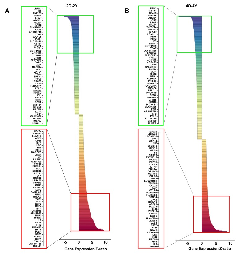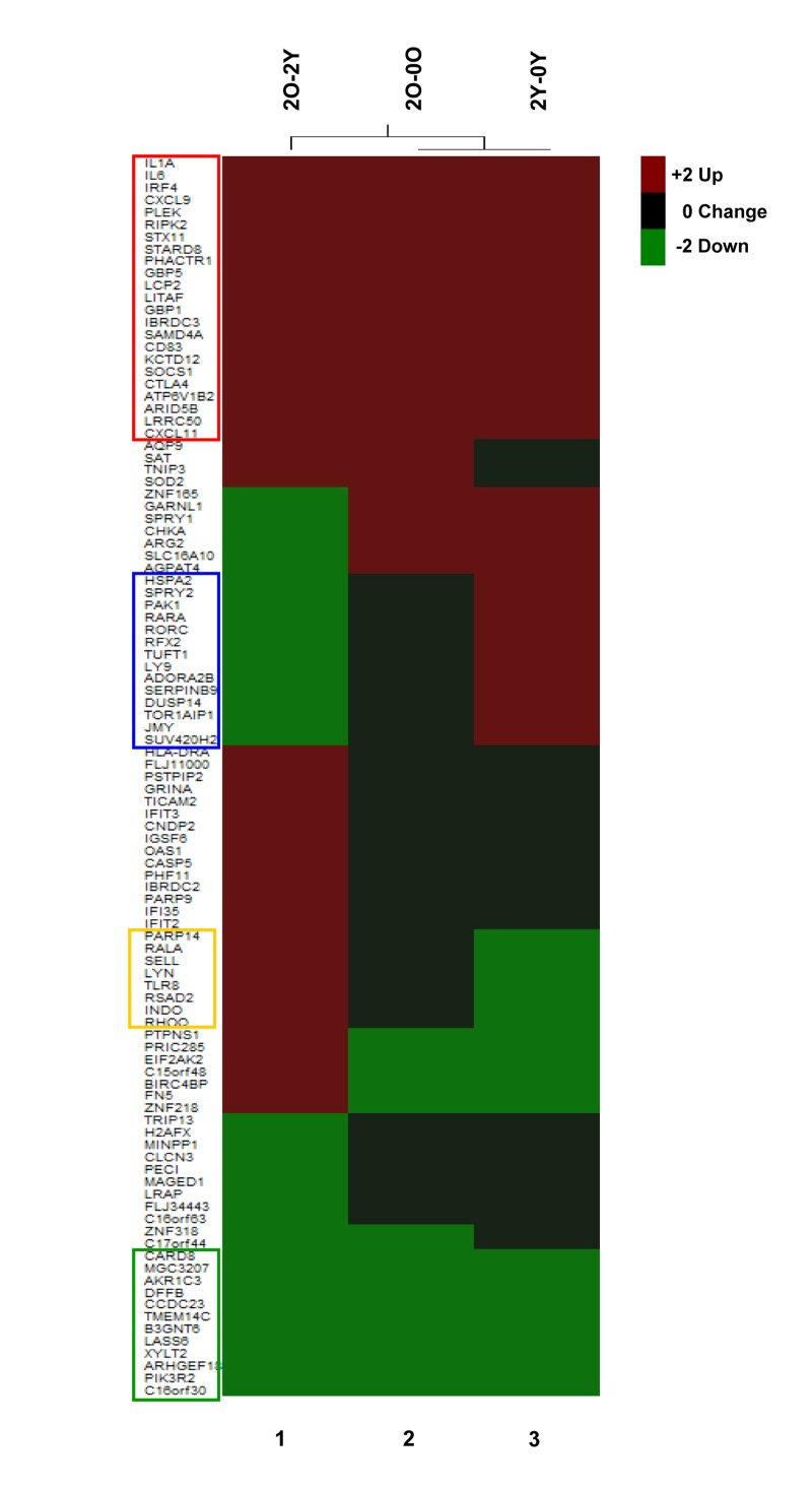 We further probed the nature of age-associated changes in TCR inducible gene expression. One perspective was provided by investigating the induction characteristics of genes whose expression was significantly different between Y and O cells after 2h activation (Figure 4, 2O-2Y). Amongst genes that were over expressed in the O group after 2h anti-CD3 treatment (Figure 4, 2O-2Y), we found 23 genes that were significantly induced in both Y and O groups (Figure 4, red box); our interpretation is that these genes are hyper-induced in the O group. Conversely, amongst genes whose expression was attenuated in the O group after 2h of anti-CD3 treatment, we found 12 genes that were repressed in both groups (Figure 4 green box); we infer that these genes are hyper-repressed in the O group. Additionally, we found genes that were induced in Y but not in O and thereby fell in the down-regulated category in a comparison of O and Y after 2h activation (Figure 4, blue box). Conversely, some genes that were turned down in response to TCR signaling in Y but not in O fell in the up-regulated category in the comparison of O and Y after 2h activation (Figure 4 yellow box). Thus, age-associated alterations in TCR signaling are reflected in complex transcriptional responses that affect inducible gene activation as well as repression. Similar categories could be seen after 4h anti-CD3 treatment (Figure S5).