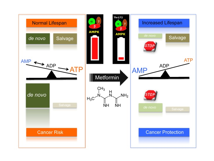 In the novel scenario illustrated by Stenesen and colleagues [23], it reasonably follows that small molecule drugs capable of mimicking the energy imbalance imposed by mutations in the AMP biosynthesis pathway may be expected to increase healthy life spans by activating AMPK. Moreover, given that AMPK is a crucial gerosuppressor (and tumor-suppressor) that impedes mTOR-driven geroconversion (and mTOR-driven malignant transformation) [1-17], small molecules capable of activating AMPK by altering the de novo synthesis of purine nucleotides such as AMP should be expected to not only inhibit the pro-aging activity of mTOR gerogenes but also prevent aging-related diseases, such as cancer. The antidiabetic biguanide metformin may fulfill all of these requirements. First, epidemiological, preclinical, and clinical evidence from the last five years has demonstrated the multi-faceted capabilities of metformin in preventing and treating human carcinomas [25-35]. Second, metformin, independently of the insulin-signaling pathway, has been noted to significantly extend the healthy lifespan of not only non-diabetic mice but also the nematode Caenorhabditis elegans [36-42]. AMPK, which is activated in mammals by metformin treatment, has also been found to be an essential molecular operative for metformin healthspan benefits in C. elegans [42], thus suggesting that the metformin gerosuppressant activity largely depends on its ability to engage the same metabolic sensor, i.e., AMPK, which is highly conserved across phyla. Third, metformin prevents cancer and extends the lifespan of cancer-prone rodent strains. Moreover, metformin can also prolong lifespan without affecting cancers in non-cancer-prone rodent strains [36-41]. Although the latter discrepancy may suggest that metformin could delay aging (and prolong life) by mechanisms unrelated to its ability to suppress cancer, it may not if this discrepancy simply relies on a cancer-related enhancement of common proximate anti-aging mechanisms by which metformin can activate the gerosuppressor/tumor suppressor AMPK. One such mechanism may be one-carbon metabolism that drives the de novo synthesis of purine nucleotides (e.g., AMP).