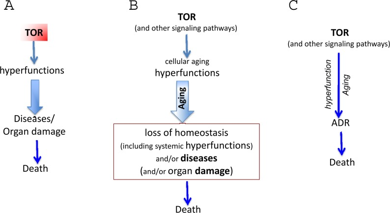 For brevity, I will use the term disease, which include loss of homeostasis (biomedical term) and non-random organ damage (Fig. 2C). Also, TOR causes cellular and system hyperfunctions (e.g., hyperlipidemia and hypertension) are continuation of cellular hyper-functions. Cellular hyperfunction is the essence of cellular aging. The consequence of hyperfunction is the organismal aging, defined as a progressive increase in death rate. Therefore, in figure 1 C, cellular and systemic hyperfunction are combined, as an essence and equivalent of aging, which drives loss of homeostasis, diseases, macro-damage and secondary decline (all combined as “disease” or malfunction in figure 3C).