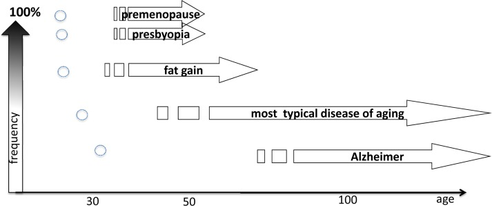 Age-related diseases (ARD), or if you prefer “loss of homeostasis (LOH)” limit lifespan in protected environments. ARD can be delayed by slowing down aging due to deactivation of the mTOR pathway by calorie restriction, genetic manipulation and drugs. The incidence of age-related diseases increases exponentially with aging. ARD include cancer, hypertension, atherosclerosis, diabetes type II, osteoporosis, sarcopenia, Alzheimer and Parkinson diseases, macular degeneration, organ fibrosis and hypertrophy and many more. Their complications (and often an immediate cause of death) include stroke, infarction, ventricular fibrillation, complications of diabetes such as renal failure, and so on. Also, menopause (in females) and presbyopia are normal age-related diseases, whose incidence does not increase indefinitely since almost all are affected by age 55 (Fig. 3). And of course “cosmetic diseases” such as baldness can be linked to hyper-function too, but this is a topic for another article.