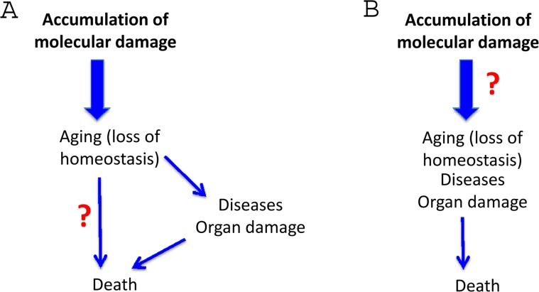 As commonly depicted [3], aging (loss of homeostasis), caused by molecular damage, in turn causes death via two independent ways (Fig. 4A). The first way is via an increased susceptibility to diseases. The second way is directly without any diseases, and is the true aging mechanism, according the molecular damage theory. This is incorrect. Consider young healthy constructor worker fall to death from the storm (Yes, this is “healthy” death but not from aging). Another example. The fall from the height of 100 year old person is due to either age-related Parkinson's disease or due to infarction. This is not death from healthy aging. This is death due to an age-related disease.