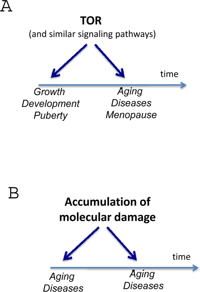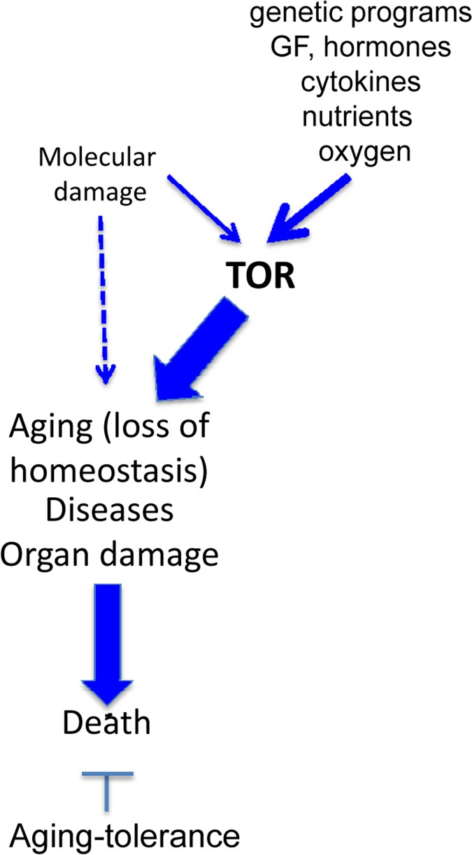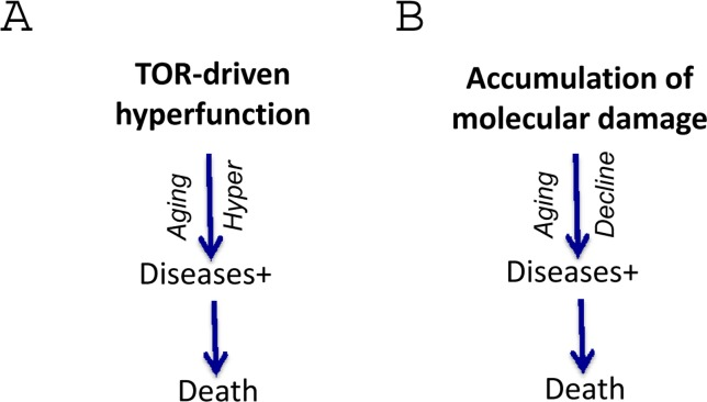 Is it true aging? Or is it just a process related to disease and mortality [3]? No, it is genuine aging. Not only because it determines mortality (a hallmark of aging is an exponential increase in mortality rate) but also because mTOR-dependent hyperfunctions, signal-resistance, hypertrophy, hypermitogenic drive coupled with loss of regenerative potential are markers of cellular senescence. Cellular senescence can be caused by mTOR activation in cell culture. Although by arresting cell cycle, DNA damage response (DDR) creates conditions for senescence (if mTOR is active), the accumulation of molecular damage itself does not cause senescence in cell culture [35, 36]. In contrast, accumulation of molecular damage contributes to cancer cell immortality [122]. Thus TOR-driven hyperfunction links cellular aging to age-related diseases and organismal aging, defined as an increase of the probability of death.