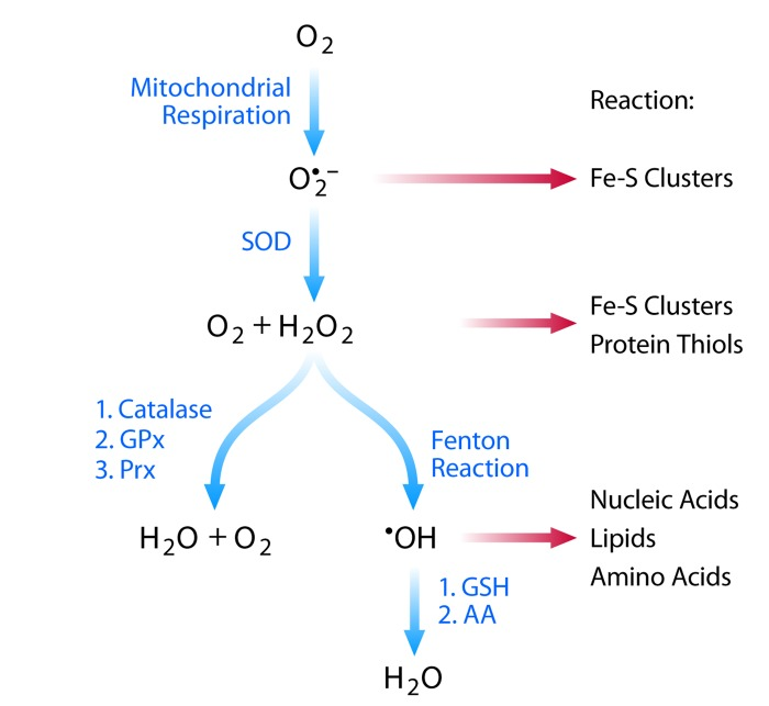 ROS are a group of compounds derived from the incomplete reduction of molecular oxygen. They include—but are not limited to—the superoxide anion (O2*−), hydrogen peroxide (H2O2), and the hydroxyl radical (OH*). While ROS are generated through a variety of mechanisms, their primary physiological source is cellular respiration. During respiration, electrons are passed through four protein complexes (Complex I, II, III, and IV) that reside in the mitochondrial inner membrane. The majority of electrons proceed through each complex and ultimately to molecular oxygen, which is reduced to water. However, a small percentage of electrons can escape the electron transport chain prematurely, leading to incomplete reduction of molecular oxygen and formation of the superoxide anion O2*−[1]. The anionic nature of O2*− restricts both its ability to diffuse throughout the cell and its reactivity toward electron-rich substrates. O2*− primarily reacts with and inactivates enzymes that contain Fe-S clusters, such as dehydratases and aconitase [2]. O2*− is detoxified by dismutation into H2O2 and O2 in a process that occurs spontaneously but is rapidly accelerated by superoxide dismutase (SOD) [3].