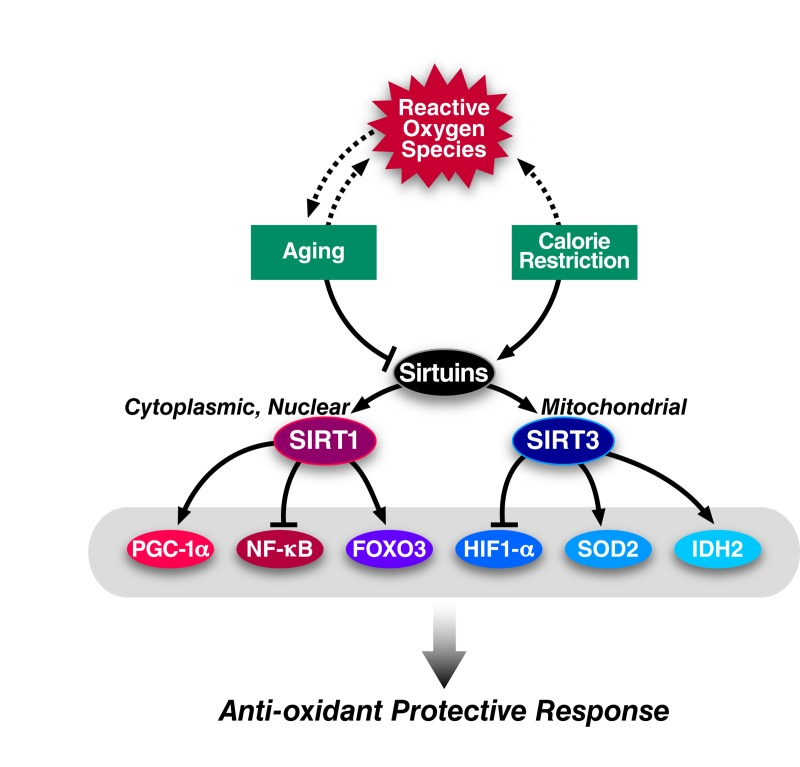 It has long been appreciated that oxidative damage increases during aging and that caloric restriction—which has been postulated to mitigate such damage—can increase the lifespan of several model organisms [5]. While the mechanisms governing caloric restriction-mediated lifespan extension and oxidative stress resistance remain incompletely understood, the sirtuin family of proteins has attracted considerable attention for regulating these phenotypes. Here, we discuss data linking the sirtuins to the oxidative stress response, caloric restriction, and longevity.