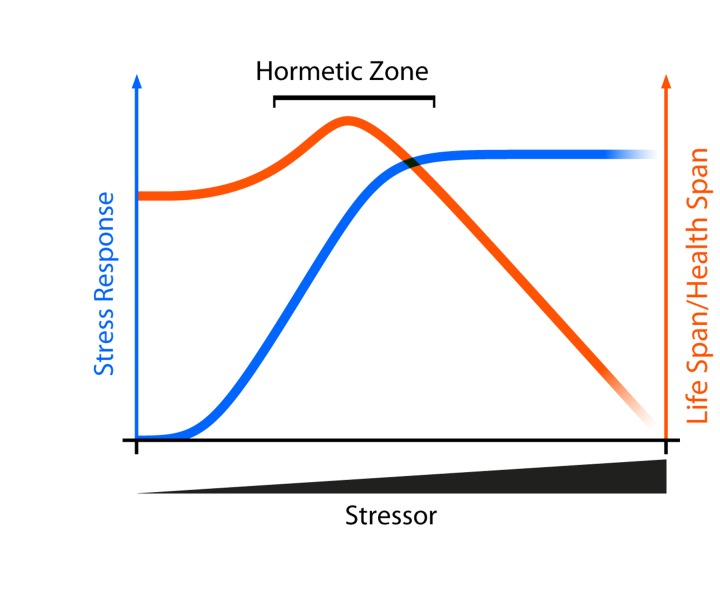 Mitohormesis may reconcile many of the seemingly conflicting data relating to the role of oxidative stress and health. First coined by Ristow and colleagues, mitohormesis is an application of the theory of hormesis in which a stressor may have beneficial effects at relatively low doses and deleterious effects at high doses [44]. Conceptually, small and/or transient amounts of reactive oxygen species elicit a protective stress response that may improve lifespan. Relatively large and/or chronic amounts of the same species, however, cause cellular damage or death because they exceed the capacity of the oxidative stress response to maintain homeostasis (Figure 3). In support of this notion, low-doses of paraquat, which induce O2-* formation, increase lifespan in Caenorhabditis elegans [45], while high-doses of paraquat reduce lifespan [46]. Mitohormesis may also explain how caloric restriction extends lifespan. Caloric restriction was originally thought to decrease the production of ROS by dampening mitochondrial respiration. However, mitochondrial respiration actually increases during caloric restriction in yeast, worms, and mice which may in turn increase ROS associated with respiration [47-49]. A moderate ROS increase during caloric restriction can stimulate oxidative stress resistance mechanisms which can minimize oxidative cellular damage over time, delay age-associated phenotypes, and extend lifespan [44, 50]. While attractive, the mechanistic link between metabolic stressors such as caloric restriction and mitohormesis remain unresolved.
