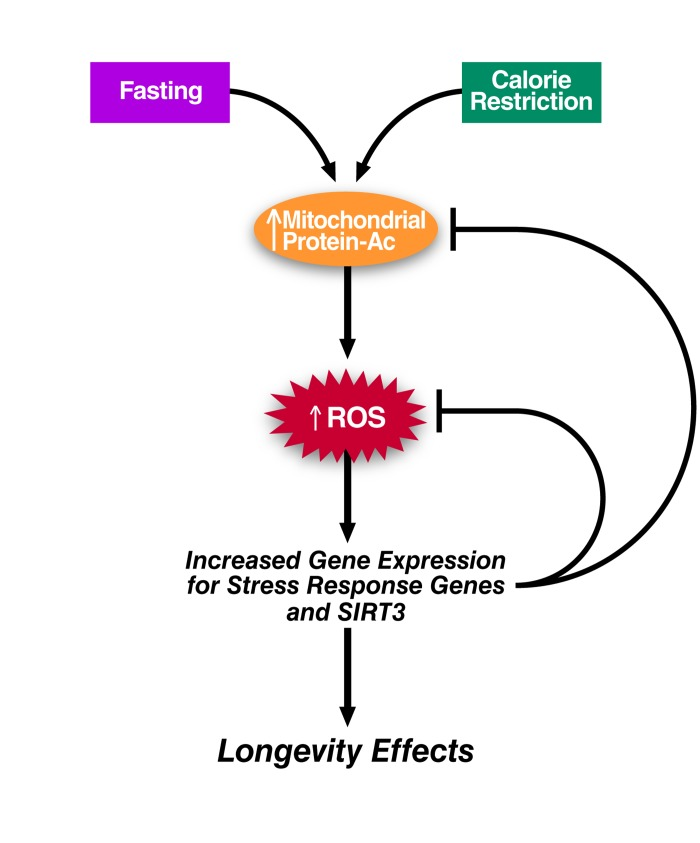 It is noteworthy that during caloric restriction, global mitochondrial protein acetylation increases in metabolically active tissue such as liver [51]. In fact, several physiological stresses including fasting and chronic high-fat feeding are associated with mitochondrial hyperacetylation [52, 53]. We speculate here that these stresses may dampen the activity of enzymes that protect against oxidative stress, such as SOD2 and IDH2, via direct acetylation [29, 54, 55]. If true, the subsequent ROS increase would promote gene expression to boost oxidative stress defense thus achieving a new hormetic steady state. In support of this notion, caloric restriction, fasting, and high-fat feeding initially spur an increase in SIRT3 transcription. Increased levels of SIRT3 could then deacetylate SOD2, IDH2, and several other mitochondrial proteins involved in redox regulation to minimize chronic ROS production. Interestingly, this response, while initially appropriate on a short-term high fat diet, is lost during chronic high fat diet feeding (>10 weeks) and associated with a downregulation of PGC-1α[53, 56]. As discussed above, the transcriptional increase of genes involved in mitochondrial energy metabolism and ROS detoxification during calorie restriction is strongly correlated with elevated expression of the transcriptional coactivator PGC-1α. This stress response may be sufficient to counter the mild stress of caloric restriction, but incapable of combating chronic high-fat feeding. When PGC-1α expression decreases, SIRT3 expression ultimately declines, oxidative stress worsens, and the fitness of the organism is diminished (Figure 4).