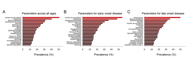 Based on the data we could now analyze the clinical parameters in the mitochondrial group by averaging the occurrence of a parameter across all the diseases in each group. This allowed us to investigate whether any particular parameter would be more prevalent among the mitochondrial diseases than among the non-mitochondrial diseases. Figure 1A shows the top 20 most prevalent parameters and supplementary figure 3 and 4 shows all the parameters in the mitochondrial group and the non-mitochondrial group, respectively. Our analysis shows that, out of 117 clinical parameters seen in mitochondrial diseases, lactate accumulation, hypotonia, muscle weakness, developmental delay and seizures are among the most common. Since it has been suggested that the clinical parameters of mitochondrial diseases depend upon the age of onset of the disease we investigated whether this was the case for our dataset. We identified the mean age of onset and standard deviation for each disease in the database (See supplementary table 1). Using this data we could then model the age of onset of each clinical parameter letting us identify the most common symptoms for diseases with onset before age 20 and most common symptoms for diseases with onset after age 20 (Figure 1B and C) and their evolution over time (Supplementary figure 5). Lactate accumulation, hypotonia, developmental delay, muscle weakness and seizures were the most prevalent parameters in the early onset diseases while hearing loss, muscle weakness, ophthalmoplegia, seizures and lactate accumulation were the most prevalent in the late onset diseases. Some differences in clinical parameters were thus found when comparing early onset to late onset disease. However, quantifying these differences as a Pearson coefficient resulted in a value of 0.5 indicating an overall similar phenotype in early and late onset diseases. In addition, there was no published data for the individual parameter onsets for every disease preventing us from using age of onset for further analysis. We therefore decided to continue our analysis without including age of onset.