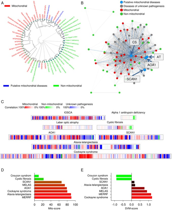 Recent studies that have shown mitochondrial dysfunction in ataxia-telangiectasia [17] , AOA1 [16], SCAN1 [15] and Cockayne syndrome [14, 20]. Interestingly, these diseases clustered tightly with the mitochondrial diseases, grouped with mitochondrial disease in the disease network and displayed a relatively high SVM and mito-score (Figure 2A-E). This indicated that our tools could be used to investigate mitochondrial dysfunction in diseases of unknown pathogenesis simply by comparing the clinical parameters with the parameters in our database.