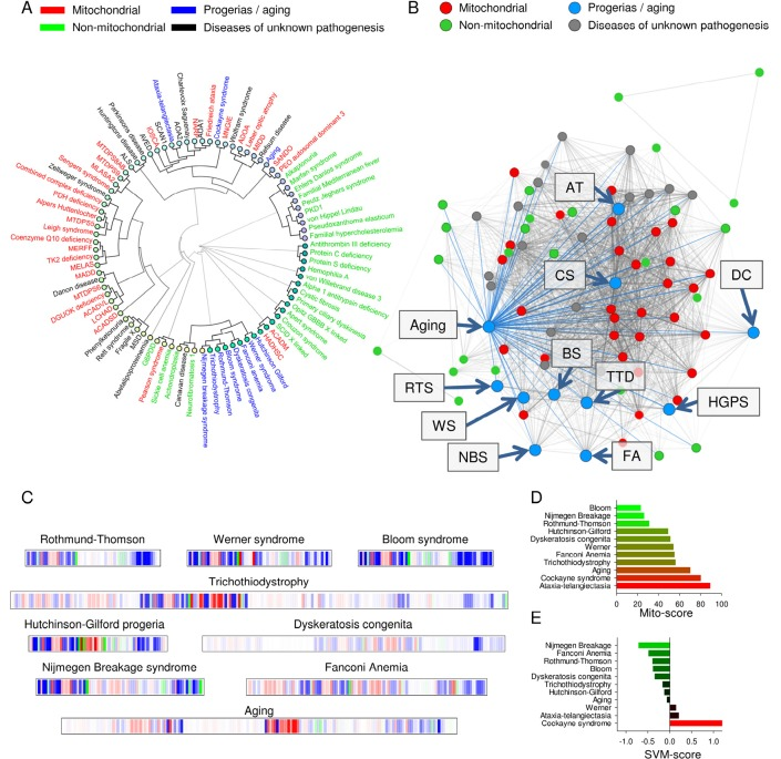 Many diseases with unknown pathogenesis were strongly associated with mitochondrial pathology (Figure 3A and supplementary table 2). Because a close correlation between aging and mitochondrial dysfunction has been proposed, we next tested whether diseases characterized by accelerated aging shared clinical parameters with the mitochondrial diseases in the database. Of all the segmental progerias tested, Cockayne syndrome and ataxia-telangiectasia correlated tightly with mitochondrial pathology in the dendrogram, while Werner syndrome, Bloom syndrome, Rothmund-Thomson syndrome, trichothiodystrophy, dyskeratosis congenita, Fanconi anemia, Nijmegen breakage syndrome and Hutchinson-Gilford progeria formed an independent cluster (Figure 3A). This was corroborated by the finding in the disease network that Cockayne syndrome and ataxia-telangiectasia appeared to lie deeper in the mitochondrial hub compared to the other progerias (Figure 3B). When looking at the barcode for Cockayne syndrome and ataxia-telangiectasia, these diseases also showed a predominantly red impression while the other progerias where less red (Figure 2C and Figure 3C). The SVM and mito-score supported all these results (Figure 2D and E and figure 3D and E). The association between the mitochondrially associated progerias, Cockayne syndrome and ataxia-telangiectasia, was related to the high degree of neurological involvement in these diseases, since removing the neuronal parameters led these diseases to cluster with the other progerias (Supplementary figure 7).