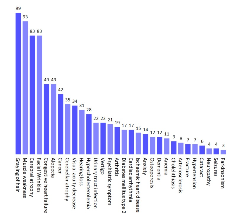 We finally investigated if normal human aging was associated with mitochondrial pathology. A number of important papers were found to describe the phenotype of normal human aging as accurately as possible (Figure 4) [21-30]. By entering the parameters of aging an interesting picture emerged. Normal aging seemed to cluster with the mitochondrial diseases where the mitochondrial segmental progerias also clustered indicating a potential mitochondrial phenotype (Figure 3A-C). Reflecting this, the barcode showed a mitochondrial imprint that was corroborated by a high mito-score of 70. However, the SVM was inconclusive reflected by a score of around 0. Interestingly, using the 200% filtered SVM, aging received a score of 1.46, indicating a probable mitochondrial impact when considering only very common clinical parameters. It therefore seems likely that some features of aging, eg. cancers, may be independent of mitochondria while others, eg. neurological features, are closely correlated with mitochondrial health.