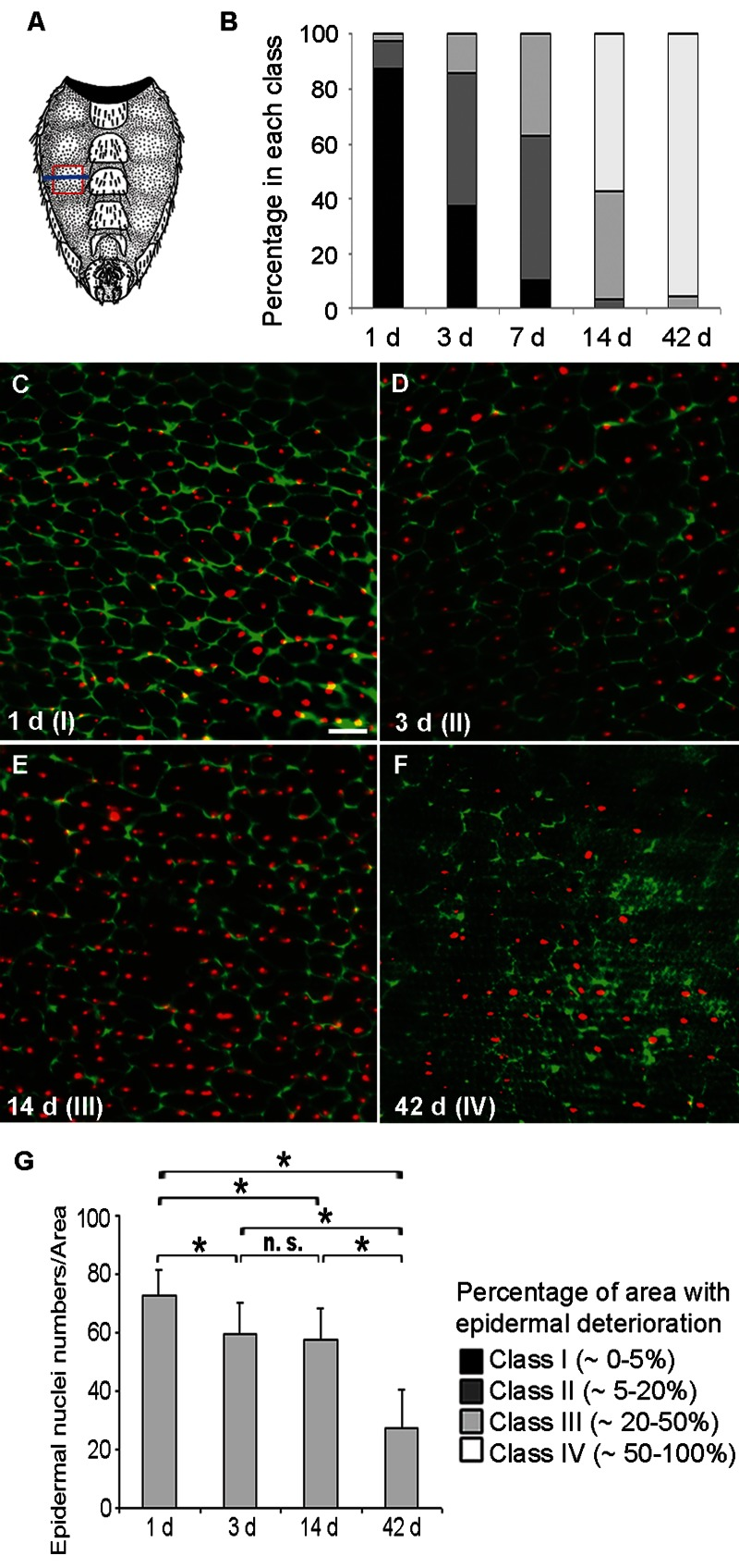 The skin shows the first obvious changes with age of any organ. Altered skin morphology is externally visible and is influenced by both extrinsic environmental factors as well as the intrinsic aging program. In humans, some of these changes include a gradual atrophy and thinning of the epidermal layer by up to 50% from the age of 30 to 80 years [12]. In addition to externally visible changes, both membrane protein levels [13] and global gene expression profiles [14] are known to change in aging skin. Because the skin sits at the interface between the organism and its environment it is a promising tissue to search for biomarkers of aging. A genetically tractable Drosophila model of skin aging would provide numerous advantages, including short lifespan, a simple monolayer epidermis, and a powerful genetic toolbox for manipulation and visualization.