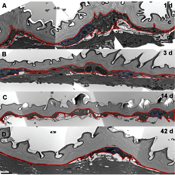 For transmission electron microscopy whole fly abdomens were individually dissected in 0.2 M sodium phosphate buffer (pH 7.2) and then immediately fixed for 4 h at room temperature in 3% glutaraldehyde, 2% paraformaldehyde and 2.5% dimethylsulfoxide in this same buffer. Samples were post-fixed in 1% Osmium tetroxide (Electron Microscopy Services, EMS, Hatfield, PA), briefly rinsed with water, stained with 2% aqueous uranyl acetate (EMS), dehydrated in graded ethanols, and embedded in Poly-Bed 812 resin (Polysciences Inc., Warrington, PA). Ultrathin sections were cut on a Leica EM UC6RT ultramicrotome (Leica Microsystems Inc., Bannockburn, IL), stained with lead citrate, and viewed in a JEM 1010 transmission electron microscope (JEOL, USA, Inc., Peabody, MA) at an accelerating voltage of 80 kV and 10,000x magnification. Digital images were obtained using the AMT Imaging System (Advanced Microscopy Techniques Corp, Danvers, MA). TEM pictures shown in Figure 2 and Figure S1, S3 and S4 consist of several overlapping pictures merged in Adobe Photoshop CS4. The cuticle-epidermis boundaries could be clearly distinguished by color, while the muscle-epidermis boundaries were defined by the intervening basal laminae.