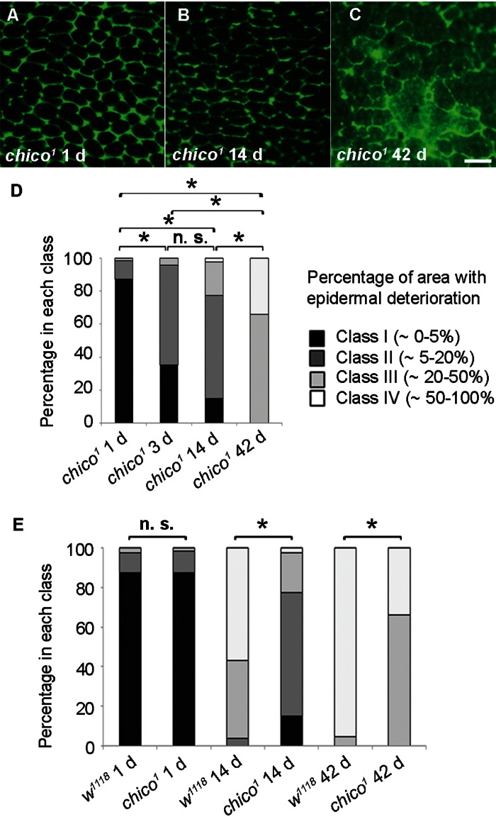 In Drosophila, flies that are homozygous mutant for the insulin-like receptor substrate (chico) have increased lifespan [27-29]. Therefore, we assessed markers of epidermal aging in chico1 flies. On day one, epidermal morphology in chico1 mutants was indistinguishable from controls (Figure 3A, E). However, epidermal membrane labeling over time was strongly preserved (Figure 3A-C) in comparison to controls (compare Figure 3B and C to Figure 1E and F). Morphological class distributions at 14 and 42 days were significantly different from age-matched controls (Figure 3E). Indeed, the 14 d old chico1 mutant epidermis most closely resembled 3 d old controls and the 42 d old chico1 mutant epidermis still looked younger than that of 14 d old controls. By TEM, the decrease in cytoplasmic volume and epidermal thickness also appeared to be decelerated (Figure S1A-C). These results are consistent with the idea that chico1 mutants, which have an extended lifespan [27] also retain the characteristics of a younger epidermis.