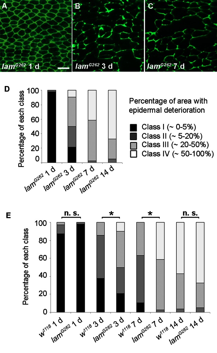 Conversely, we investigated if a mutation that shortens lifespan would affect epidermal aging. In humans, disorders that resemble premature aging, including atypical Werner syndrome and Hutchinson-Gilford progeria syndrome, have been linked to mutations in genes encoding lamin proteins [30-32]. The premature aging phenotype in these disorders is accompanied by a reduced lifespan. Whether laminopathy disorders truly represent accelerated aging is vigorously debated [33] but it is clear that many of these diseases are characterized by an early onset of gene expression changes and morphological skin changes resembling those of normal aging [34]. We thus investigated if a mutation in a Drosophila lamin gene would alter epidermal morphology. Although many lamin mutant alleles do not survive to the adult stage, adult escapers of a B-type lamin allele, lamG262[35], have a shortened lifespan [36]. In 1 d old lamG262 flies epidermal morphology resembled controls (Figure 4A), suggesting that development of the adult epidermis during pupariation proceeded normally. By 3 days and 7 days, the lamG262 mutant epidermis showed more morphological deterioration than control epidermis of the same age (Figure 4B and C) and the classification of lamG262 mutant epidermal pictures (Figure 4D) supported an accelerated epidermal deterioration at these time points compared to controls (Figure 4E). In 14 d old lamG262 flies epidermal morphology did not look significantly different. Finally, TEM revealed strong nuclear condensation at 3 days compared to control nuclei at this time point (Figure S2B). Although there was no obvious difference in epidermal thickness in 3 d old lamG262 mutants compared to age-matched controls, TEM samples of lamG262 mutants exhibited altered cellular morphology. In summary, these results suggest that epidermal aging is accelerated at early time points in lamG262 mutants compared to control flies.