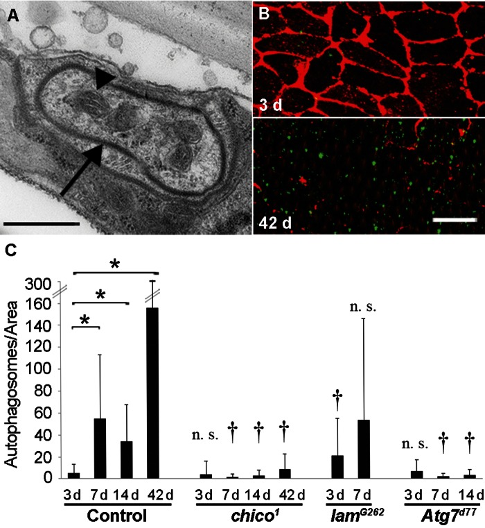 The dramatic loss of membrane and cytoplasm in aging epidermal cells suggested that autophagy might drive the observed changes in morphology. We thus examined the aging epidermis for markers of autophagy. Consistent with the hypothesis that autophagy was responsible for the loss of membrane and cytoplasm, we found large autophagosomes in 14 d old control flies (Figure 5A). We next quantified epidermal autophagosomes at different ages and in different genotypes using a transgene, UAS-LC3-GFP, that labels autophagosomal membranes. We compared 3 d and older flies to avoid high autofluorescence levels in the 1 d old epidermis. Autophagosome numbers increased significantly from 3 d to 42 d in controls (Figure 5B and C). As expected, autophagosome numbers remained low in Atg7d77 flies with disrupted autophagy [37] and in chico1 mutants regardless of age. By contrast, autophagic activity on day 3 (but not day 7) was higher in lamG262 flies than in controls. In conclusion, an early rise in autophagy levels (lamin mutant) compared to controls correlates with accelerated epidermal aging. Conversely, a decrease in autophagy levels (chico or Atg7 mutants) correlates with decelerated epidermal aging.