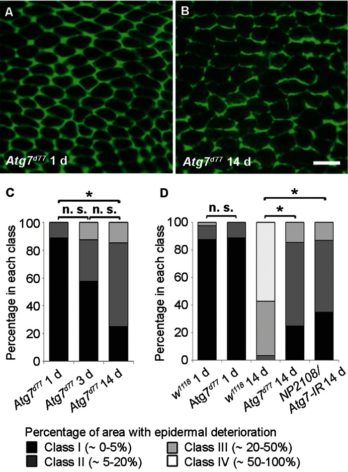 These findings prompted us to test if autophagy drives age-related epidermal morphology changes since autophagy can drive developmental [38] and physiological remodeling of tissues [39]. Like chico1 and lamG262 mutants, the initial epidermal morphology of Atg7d77 flies resembled controls (Figure 6A). Interestingly, at 14 d loss of epidermal membrane labeling was strongly decelerated in comparison to controls (compare Figure 6B to Figure 1E and Figure 6C to Figure 1B). Additionally, TEM analysis revealed a thicker epidermal layer in 14 d old Atg7d77 flies compared to control epidermis of the same age (Figure S4).