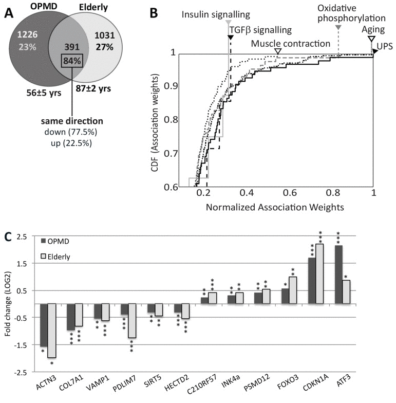 We then investigated whether aging- or OPMD-regulated genes are correspondingly enriched in recognized aging concepts. We employed the literature association method [24] with the concepts: aging, muscle contraction, oxidative phosphorylation, insulin signalling, tumour growth factor (TGFβ) signalling and the ubiquitin proteasome system (UPS). The literature association of every gene with each of the 6 concepts was determined and normalized association-weights were assigned. Association enrichment for the significantly regulated genes in each concept was evaluated with the Cumulative Distribution Function (CDF). The distribution of association-weights for the aging concept had a maximum score indicating that the common genes between OPMD and elderly indeed represent well-known aging genes (Figure 1B). As expected, significant scores were also found for oxidative phosphorylation and muscle contraction. Next to the aging concept, the UPS also rated with a maximum score, suggesting that UPS genes have highest impact for both OPMD and elderly. The high significant score indicates that the association is not random (P = 4.3×10−39, 8.1×10−25 and 2.4×10−26, for UPS, oxidative phosphorylation and muscle contraction respectively). In contrast, the distributions of weight-associations for genes in the insulin or TGF-β signalling pathways were not strong (Figure 1B), and P-values did not differ from a theoretical random distribution. This analysis suggests that similar genes involved in the UPS, mitochondria and muscle contraction affect muscle weakness in both elderly and in OPMD. The genes affecting the insulin or TGF-β signalling pathways, however, differ between OPMD and elderly. To visualize the molecular similarity between OPMD and elderly we plotted the mean fold change for well-known aging-regulated genes [25] (Figure 1C). Together our analysis revealed a significant consistencyin molecular signatures that characterize VL muscles in OPMD patients and in elderly.