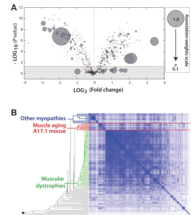 We further studied the association of the OPMD transcriptome with aging using the transcriptome of the A17.1 mouse at 6-weeks old, as muscle weakness is not obvious at that age (Trollet et al., 2010). In the A17.1 mouse expPABPN1 is overexpressed under a muscle-specific promoter resulting in severe muscle weakness (Davies et al., 2005) and muscle atrophy at an early age [15]. A literature-aided association study of the differentially expressed genes in the A17.1 muscles of 6 weeks-old mice showed that a large subset of these genes strongly associates with the aging concept (Figure 2A). The fold-change for the genes with a high association-weight score was large (Figure 2A), indicating that well-known aging genes are highly dysregulated in this mouse model.