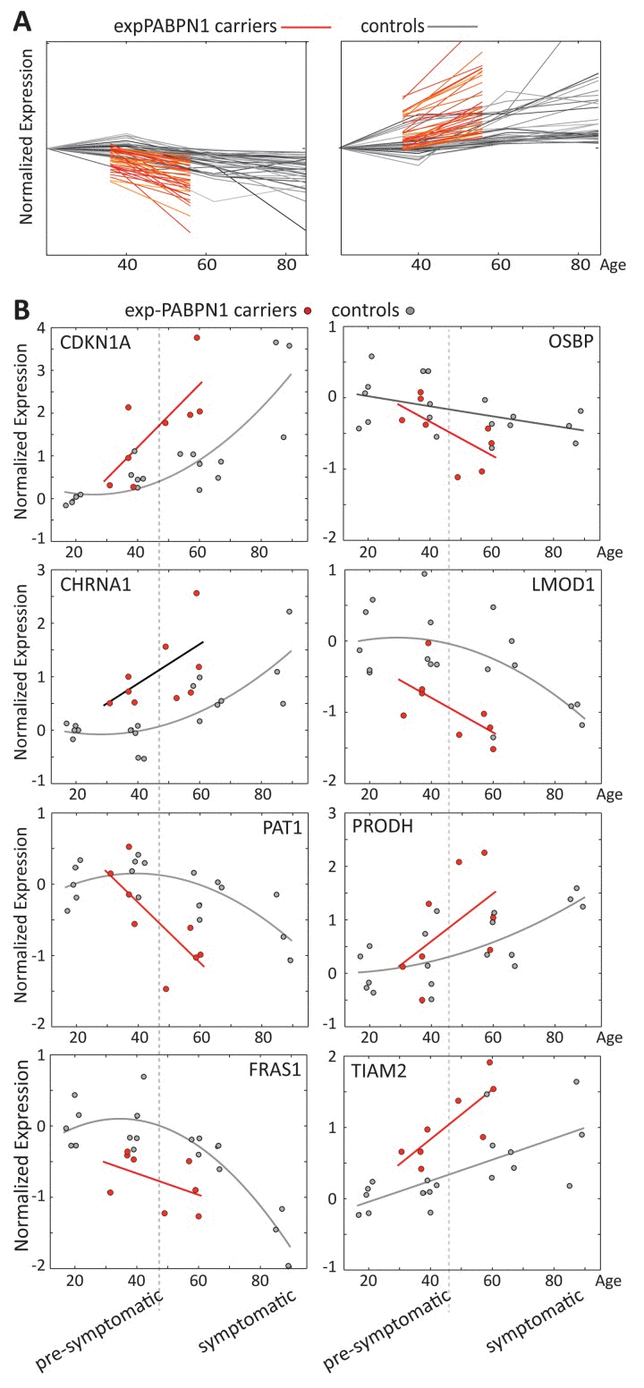 High overexpression of expPABPN1 or depletion of PABPN1 by RNA interference in muscle causes myogenic defects [16-20]. These models have been instrumental to demonstrate that manipulations in PABPN1 expression levels cause muscle symptoms. As yet, however, it is unclear how ubiquitously expressed PABPN1 causes predominant skeletal muscle pathology and why symptoms in OPMD initiate only after midlife. Here we investigated the hypothesis that OPMD represents accelerated aging myopathy. We compared genome-wide expression profiles from Vastus lateralis (VL) muscles of OPMD patients and elderly and identified significant similarities. In concurrence with severe muscle weakness in OPMD, age-dependent molecular changes are often augmented in OPMD muscles. We also identified an age-dependent decline in PABPN1 levels. This decrease in PABPN1 levels starts only from the fifth decade and is accelerated in OPMD. In culture, PABPN1 down-regulation induces muscle cell aging and myogenesis defects that are proportional to a decrease in PABPN1 levels. We suggest that PABPN1 regulates muscle cell aging.