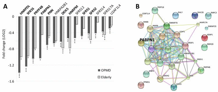 The mRNA processing and spliceosome GO-terms were the most significantly affected in both OPMD and elderly datasets (Table 2). Noticeably, the majority of the dysregulated genes in this category were down regulated (Figure 4A). Network analysis suggests that central hubs are affected in both OPMD and elderly, including PABPN1 (Figure 4B).