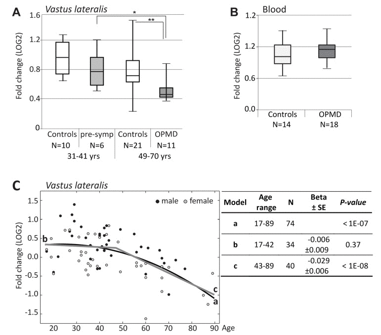 Next, levels of PABPN1 mRNA during aging were determined in VL from 74 healthy controls age 17-89 using RT-qPCR. Fold-change was calculated from GUSB housekeeping gene and young control group at age 17-22 years. A significant decrease in PABPN1 expression with age was observed with a quadratic model (Figure 5C). Using two sequential linear models the decline in this dataset was found from 43 years onwards, whereas between 17-42 years the change in expression levels was insignificant (Figure 5C). Together, our analysis reveals that PABPN1 expression declines with aging from the fourth decade onwards and that this decline is accelerated in OPMD.