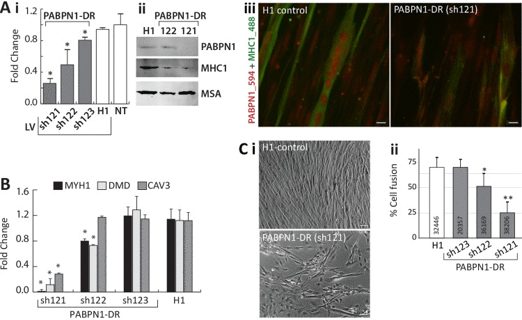 Next, we investigated whether PABPN1-DR specifically affect expression levels of myogenic genes. We selected MYH1, DMD and CAV3 for RT-qPCR analysis, as their expression levels significantly decreased in both OPMD and elderly. The strongest decrease in expression of all three genes was found in the sh121 cultures with highest PABPN1-DR (Figure 6B). Only a moderate decrease across all three genes was found in the sh122 culture, and expression levels did not differ from controls in the sh123 culture (Figure 6B). The decrease in MHY1 on mRNA level was confirmed on the protein level (Figure 6A). This suggests that levels of PABPN1-DR can induce a decrease in cell fusion. An apparent decrease in cell fusion was found in the strong PABPN1-DR, sh121, cultures (Figure 6Ci). We then determined rate of cell fusion across PABPN1-DR fused cultures index using a semi-automated and robust imaging procedure, where the percentage of nuclei within cells expressing MHC1 was quantified. The rate of cell fusion was not affected in the mild PABPN1 down-regulated culture, sh123, but in sh122 or sh121 cultures cell fusion significantly reduced (Figure 6Cii). Together the results here reveal that a decrease in PABPN1 expression induces myogenic defects that are proportional to levels of PABPN1-down-regulation.