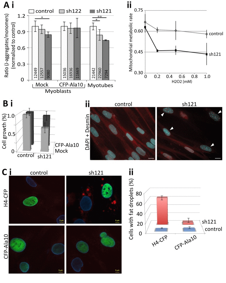 Aging cells undergo substantial cellular changes [29]. To investigate whether a decrease in PABPN1 expression induces cellular characteristics of aging cells, we applied four different cellular assays. Reduced mitochondrial metabolic rate is often found in aged skeletal muscles [30]. Using JC-1 labeling, we found a decrease in mitochondrial metabolic rate in both myoblast and myotube cultures with PABPN1 down-regulation compared with control cultures (Figure 7Ai). The effect of PABPN1-DR on the mitochondrial metabolic rate was more pronounced and more significant in myotube cultures compared with myoblasts cultures (Figure 7Ai). Importantly, a decrease in mitochondrial metabolic rate was restored in PABPN1-DR cultures after transduction with CFP-PABPN1 lentivirus particles (Figure 7Ai). Noticeably, the decrease in metabolic rate, levels of myogenic genes and fusion index correlated with levels of PABPN1-DR. As levels of mitochondrial metabolic rate are decreased due to aging-regulated increase in oxidative stress [31], next we investigated whether PABPN1 affect cell sensitivity to oxidative stress. Muscle cell cultures were treated with H2O2 and mitochondrial metabolic rate was determined after JC-1 labeling. PABPN1-DR muscle cells are 1.5-fold more sensitive to H2O2 treatment compared with control cells (Figure 7Aii). In addition, Levels of PABPN1 also affect rates of cell growth. PABPN1-DR cells have a slower growth rate compared with control, and restored after transduction with CFP-PABPN1 lentivirus particles (Figure 7Bi). In PABPN1-DR cells heterochromatic foci, which mark senescent cell [32], were also detected (Figure 7Bii). Last, we also found that PABPN1-DR induces formation of fat droplets in muscle cell cultures (Figure 7C). Importantly, restoring PABPN1 levels with CFP-PABPN1 decreased the proportion of cells with fat droplets (Figure 7Ci). Together, these studies indicate that reduced levels of PABPN1 induce muscle cell aging.