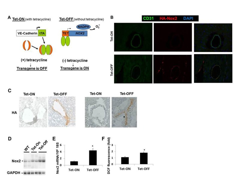All animal experiments were approved by the Lifespan Institutional Animal Care and Use Committee. The binary tetracycline (Tet)-ON/Tet-OFF system and VE-Cadherin promoter were used to render the transgene inducible and endothelium-specific, respectively [54]. In brief, the HA-tagged NOX2 gene was placed downstream of a Tet (TRE) promoter in one mouse (Tet-NOX2) and the tTA gene was placed under a VE-Cadherin promoter in another mouse (VE-Cad-tTA) (Fig. 1A). Cross-breeding of Tet-Nox2 and VE-Cad-tTA mice were carried out to obtain double transgenic NVF (Tet-Nox2:VE-Cad-tTA) mice. To identify double-positive NVF transgenic mice, PCR was carried out using Platinum® PCR Supermix (Invitrogen). The primer sequences flanking Tet-responsive element (TRE) upstream and Nox2 ORF downstream were used: for sense primer 5'- AGA GAA AAG TGA AAG TCG AGC TCG GT -3', and for antisense primer 5'- TGT GCA GTG CTA TCA TCC AAG C -3'. The primer sequences for VE-Cadherin-tTA were: Sense – 5'- CAG TAG TAG GTG TTT CCC TTT CTT -3', and antisense – 5'- GAC GCC TTA GCC ATT GAG AT -3'. Expression of the transgene (NOX2) was turned-off in double transgenic (NVF) by adding tetracycline (Tet-ON) in the drinking water since in utero. Withdrawal of tetracycline (Tet-OFF) for at least two weeks was required to achieve ~4-fold increase in expression level of Nox2 mRNA and ~1.8-fold increase in ROS levels in ECs (data not shown). For all experiments reported here, tetracycline (Tet) was withdrawn (Tet-OFF) for a minimal period of two weeks to a maximum period of 12 weeks, whereas the sex-matched littermates on Tet were used as control (Tet-ON). HA-tag was used to differentiate between the endogenous gene product and the transgene. All experiments were carried out using age- and sex-matched (male) animals. Two independent lines of the NVF transgenic mice were used in the current study.