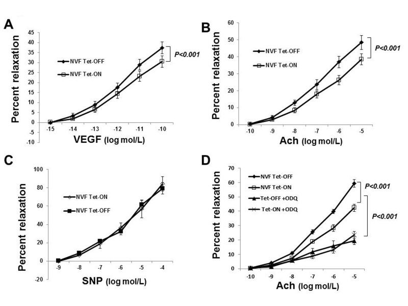 The established dogma or classical belief is that ROS reduce bioavailability of NO by converting it to peroxynitrite (ONOO) and thus inhibit endothelium-dependent vasorelaxation. There are, however, conflicting reports about the roles of ROS in vascular biology. Recent findings by others [37] and us [10] demonstrated that NADPH oxidase-derived ROS are essential for endothelium-dependent vasorelaxation. Failure of the clinical trials using antioxidants to improave the health of cardiovascular patients also suggested a critical role for ROS in vascular function [5-8]. To determine whether EC-ROS resulted in the improvement of coronary vasorelaxation or not, we isolated coronary microvessels from Tet-ON and Tet-OFF NVF transgenic mice (8-12 weeks old) and subject endothelium-dependent microvessel reactivity assays using vascular endothelial growth factor (VEGF) and acetylcholine (Ach) as described [10]. Tet-OFF coronary vessels showed significantly increased (by >22%) vasodilation over Tet-ON vessels in response to VEGF and Ach, however, there was no difference in SNP induced relaxation in these vessels (Fig. 2), suggesting that increased ROS levels in EC resulted in endothelium-dependent vasodilatation in coronary vessels. Non-specific effects of tetracycline on Tet-ON animals were excluded by performing microvessel reactivity assays on coronary vessels from WT animals that were treated with or without tetracycline for eight weeks (Supplemental Fig. 2A). Endothelium denudation and eNOS-inhibitor L-NAME (300 μmol/L) inhibited microvessel reactivity in both Tet-ON and Tet-OFF coronary vessels (data not shown), suggesting endothelium-generated NO plays a major role in coronary vasorelaxation. Inhibition of vasodilatation in Tet-OFF animals by another NO-scavenger carboxy-PTIO (200 μmol/L) (Supplemental Fig. 2B), further supported this notion. Supplementation of drinking water with tetracycline in Tet-OFF mice for 4 weeks (Tet-OFF+Tet-ON) and incubation of coronary vessels with ROS-scavenger NAC reduced vasodilation in Tet-OFF animals to the level of that of Tet-ON mice (Supplemental Fig. 2B), suggesting specific role for NADPH oxidase-derived inducible ROS in vasodilatation in these binary transgenic animals. One may wonder whether increased level of ROS and NO resulted in higher ONOO− levels in Tet-OFF vessels, which in turn was responsible for increased vasorelaxation. To address this, microvessel reactivity assays were performed using nitric oxide-cGMP inhibitor, ODQ (10 μmol/L). ODQ inhibited vasodilatation in both Tet-ON and Tet-OFF coronary arterioles (Fig. 2D). Together with c-PTIO data (Supplemental Fig. 2B), these findings suggest that NO, but not ONOO−, plays a major role in EC-ROS-mediated increase in vasorelaxation.