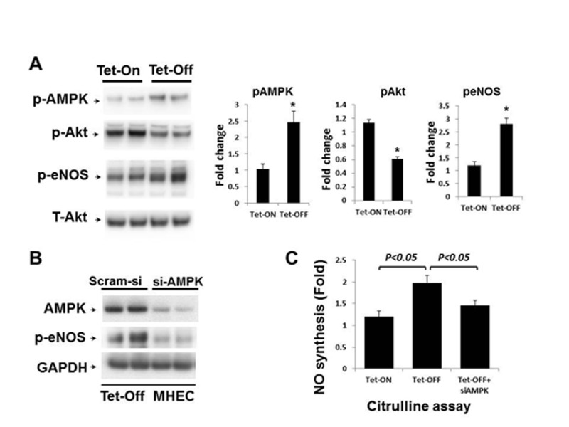 In order to examine the effects of increased ROS on eNOS activation and NO bioavailability, Tet-ON and Tet-OFF MHEC lysates were subject to Western blot analysis. Tet-OFF MHEC demonstrated increased phosphorylation of eNOS (Ser1179) in an AMPK-dependent manner (Fig. 3A-3B). However, there was no difference in total eNOS expression between Tet-ON and Tet-OFF MHEC (Supplemental Fig. 3). AMPK-dependent eNOS activation by EC-ROS was further confirmed by demonstrating increased NO levels in Tet-OFF MHEC and its inhibition by si-AMPK, as determined by citrulline assay (Fig. 3C). Akt phospho-rylation remained unchanged (Fig. 3A). Together, these fidnings suggest increase in EC-ROS results in activation of eNOS in an AMPK-dependent mechanism.