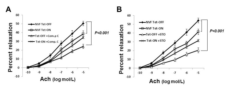 Since eNOS activation in Tet-OFF MHEC is AMPK-dependent, we wanted to examine whether the increase in coronary vasorelaxation in Tet-OFF NVF mice was AMPK-mediated. To that end, isolated coronary vessels from Tet-ON and Tet-OFF transgenic mice were subject to microvessel reactivity assay in the presence or absence of AMPK inhibitor, Compound C (80 μmol/L). Ach- and VEGF-mediated coronary vasodilatation was inhibited by Compound C in Tet-OFF mice, whereas Compound C had no significant effect on the coronary vessels from Tet-ON mice (Fig.4A shows Ach-mediated microvessel reactivity). These results suggest that the observed increase in Tet-OFF coronary vasodilatation was, at least in part, induced by an AMPK-mediated endothelium-dependent signaling pathway.