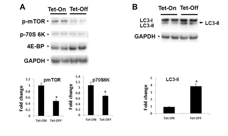 AMPK activation is known to have inhibitory effects on mTOR signaling[38, 39]. Since Tet-OFF MHEC with higher levels of ROS demonstrated increased activation of AMPK, we examined whether downstream mTOR/p70S6K/eIF-4E-BP signaling were also affected. Western blots analysis demonstrated marked reduction in mTOR/p70S6K signaling in MHEC with higher ROS (Fig. 5A). Reduction in mTOR signaling was further confirmed by increased levels of 4E-BP, a protein which is degraded by mTOR-mediated phosphorylation, in Tet-OFF MHEC (Fig. 5A). Together, these results suggest that higher levels of NADPH oxidase-derived ROS inhibit mTOR signaling pathway in ECs.