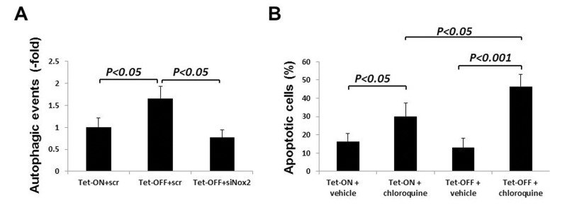 To determine whether increased autophagy was due to increased ROS levels, we transfected Tet-OFF MHEC with siRNA-Nox2 (si-Nox2) or pre-treated with NAC (300 μmol/L). Reduction in ROS resulted in inhibition of autophagy in Tet-OFF MHEC (Fig. 7A shows data using si-Nox2), suggesting a role for Nox2-derived ROS in increased autophagy in Tet-OFF MHEC. Next, we wanted to examine whether increased autophagy played a protective for the survival of MHEC with higher ROS levels. Tet-OFF MHEC were treated with chloroquine to inhibit autolysosome formation (chloroquine prevents acidification of lysosomes resulting in inhibition of proteolytic activitiy). Chloroquine-treated Tet-OFF MHEC had significantly higher levels of apoptotic cell death compared to vehicle-treated Tet-OFF MHEC (Fig. 7B), suggesting a protective role for increased autophagy in the survival of ECs with high ROS levels.