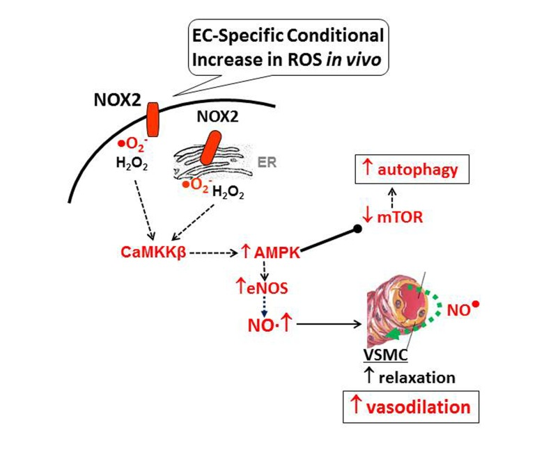 To examine endothelial responses to conditional in vivo increase in EC-specific endogenous ROS in adult animals, we have generated a novel binary (Tet-ON/OFF) transgenic mouse that induces EC-specific 1.8±0.42-fold increase in Nox2/gp91phox (NADPH oxidase 2)-derived ROS for four to 12 weeks. Using isolated mouse heart EC (MHEC) and coronary microvessels, we demonstrate that conditional increase in EC-specific ROS induces AMPK-eNOS-mediated endothelium-dependent coronary vasodilatation, and AMPK-mTOR-mediated protective autophagy in MHEC.