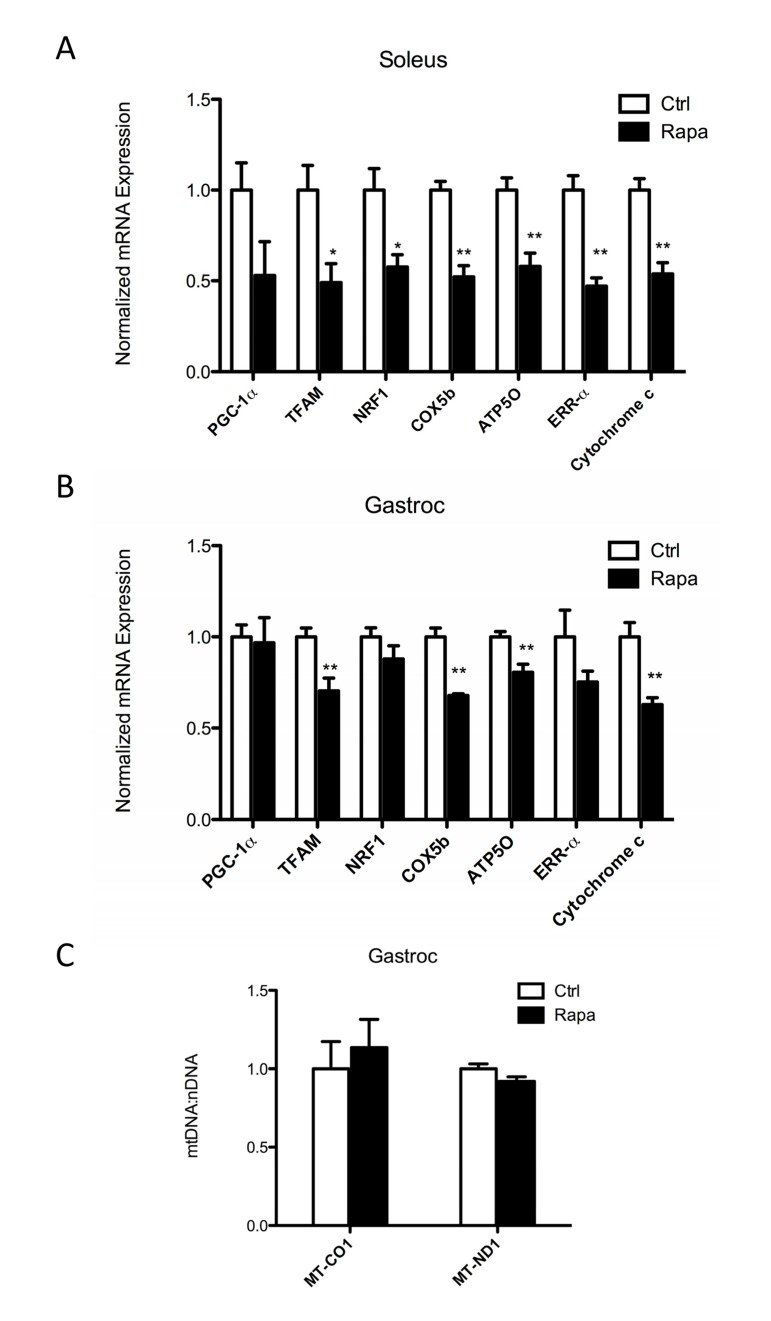 Rapamycin treatment (2 mg/kg daily by intraperitoneal injection) decreased the mRNA expression of genes involved in mitochondrial biogenesis, including mitochondrial transcription factor A (TFAM), nuclear respiratory factor 1 (NRF1), and estrogen-related receptor α (ERRα), as well as genes involved in oxidative phosphorylation, including cytochrome c oxidase subunit 5B (COX5b), ATP synthase subunit O (ATP5O), and cytochrome c in gastrocnemius and soleus muscles, but not in the liver (Figures 1 and S1). These changes were most prominent in the highly oxidative soleus muscle, consistent with the findings of Cunningham et al. [29] and Blattler et al. [32].