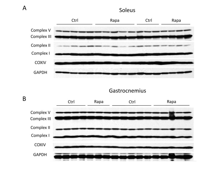 Despite clear changes in message levels, we found that the expression of mitochondrial proteins involved in oxidative phosphorylation was unchanged by rapamycin treatment. We employed a series of monoclonal antibodies that detect representative subunits of each oxidative phosphorylation complex. This approach is predicted to give a reliable indication of overall complex assembly, since the subunits targeted by the monoclonal antibodies are labile when not properly incorporated into their respective oxidative phosphorylation complexes. No consistent changes in mitochondrial protein expression were observed in either the gastrocnemius or soleus muscles (Figure 2), or in the liver (Figure S2). Therefore, expression of mitochondrial proteins in the skeletal muscles of C57BL/6 mice was not affected by two weeks of intraperitoneal injection of rapamycin at a dose sufficient to cause metabolic dysfunction and to extend life.