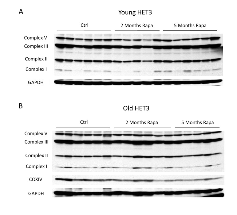 Given the range of dosing strategies that have been used for rapamycin [9], as well as the long half-life of some mitochondrial proteins [33], we chose to examine the expression of mitochondrial proteins under the specific conditions that have been shown to increase longevity. Accordingly, these experiments employed HET3 mice (offspring of a cross between Balb/cByJ × C57BL/6J F1 mothers and C3H/HeJ × DBA/2J F1 fathers), which are expected to be free from any recessive defects present in the parental lines, display a long lifespan, and are known to respond to DR [34, 35]. Young or old HET3 mice were fed a diet containing encapsulated rapamycin at 14 ppm for 2 or 5 months and compared to age-matched controls fed the same diet lacking rapamycin. The effects of this regimen on glucose homeostasis were described previously [36]. As was the case in C57BL/6 mice injected with rapamycin, mitochondrial protein expression was unchanged in HET3 mice fed the rapamycin-containing diet for up to five months (Figure 3). Therefore, we were not able to detect any consistent change in mitochondrial protein expression using the rapamycin treatment regimen that extends mean and maximum lifespan in mice.