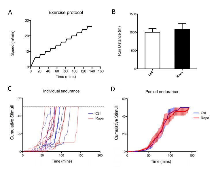8-week-old male C57BL/6 mice were injected intraperitoneally with saline or rapamycin (2mg/kg) once daily for two weeks. During the third week of injection, 9 control mice and 9 rapamycin-treated mice were tested for endurance on a treadmill (Columbus Instruments Treadmill 3.2, Columbus, OH, USA). Mice were provided with a 10-minute warm up period where speed incrementally increased to 6 m/min. After the 10-minute warm up, mice were subjected to increased speeds at 12-minute increments. Each cycle consisted of 10 minutes of constant speed, followed by 2 minutes of acceleration to 2 m/min faster. Exhaustion was defined as the time point when a mouse had cumulatively received 50 electric shocks from a grid at the back of the treadmill, a point that has been found to reveal differences in endurance in other systems [56]. The number of shocks, total running time and distance were recorded.