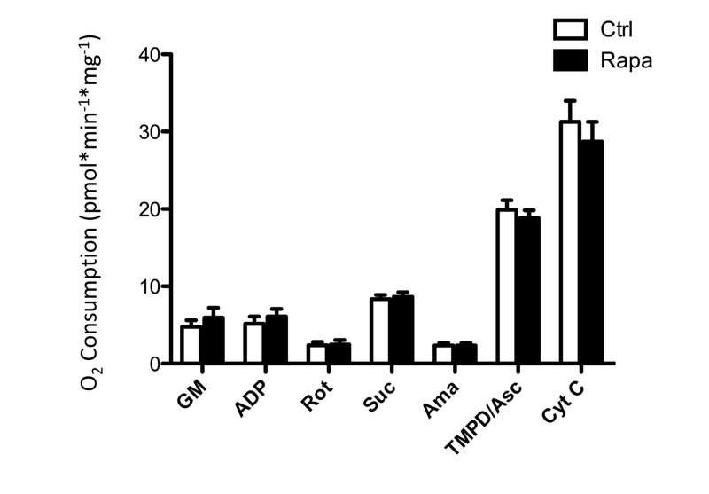 Fresh soleus muscle was isolated from male C57BL/6 mice treated with either 2 weeks of intraperitoneal rapamycin or saline vehicle. Skeletal muscle tissue (2 mg) was placed in cold biopsy preservation solution (BIOPS) consisting of 50 mM K+-MES, 20 mM taurine, 0.5 mM dithiothreitol, 6.56 mM MgCl2, 5.77 mM ATP, 15 mM phosphocreatine, 20 mM imidazole (pH 7.1 adjusted with 5 N KOH at 0°C), and 10 mM Ca-EGTA buffer. While in cold BIOPS, connective tissue was removed and the muscle fibers were mechanically separated with fine forceps. Muscle fibers were then permeabilized using saponin (50 μg/ml BIOPS). Muscle fibers were added to ice cold saponin/BIOPS and gently agitated for 30 minutes. Fibers werehen transferred into ice-cold mitochondrial respiration medium (MiRO5) with catalase (280 units/ml) and gently agitated on ice for an additional 10 minutes. MiRO5 consists of 110 mM sucrose, 60 mM K+-lactobionate, 0.5 mM EGTA, 3 mM MgCl2, 20 mM taurine, 10 mM KH2PO4, 20 mM HEPES adjusted to pH 7.1 with KOH at 37°C; and 1 g/L BSA essentially fatty acid free). After weighing, 1 mg of permeabilized fibers were transferred to anOxygraph-2k chamber (Oroboros Instruments, Austria) and suspended in MiRO5 plus catalase at 37°C. After stabilization (~ 10 minutes), oxygen consumption was measured in real-timeafter adding mitochondrial complex substrates and inhibitors sequentially.. Complex I dependent respiration was measured by add glutamate (10 mM), malate (2 mM) and then ADP (5 mM); Complex II dependent respiration was then determined by adding rotenone (0.5 μM) and succinate (10 mM), and finally complex IV dependent respiration was determined by adding Antimycin A (2.5 μM); tetramethylphenylenediamine (TMPD, 0.5 mM) ascorbate (2 mM) and Cytochrome c (10 μM).