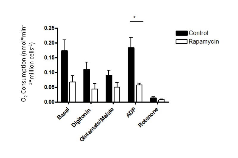 The C2C12 mouse myoblasts were grown in Dulbecco's modified Eagle's medium supplemented with 10% fetal bovine serum and 1% penicillin/streptomycin. The C2C12 cells were treated with 500 nM rapamycin for 24 hours, which we have previously been shown to inhibit respiration [28].