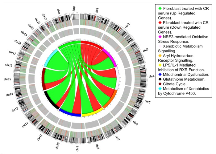 Representation of differentially expressed genes in their Genomic localization and visual representation of their relationships with the different pathways were produced using CIRCOS software [28]. Statistical analysis of real time PCR and cell proliferation data was performed using Student's t test to compare the transcripts relative abundance in the CR group and WD group. P values <0.05 were considered statistically significant.